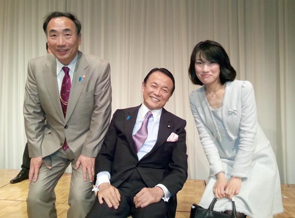 満面の笑みを浮かべる籠池前理事長、長女・町浪氏と写る麻生大臣(菅野完氏・赤澤竜也氏提供)