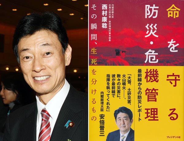 西村官房副長官(左)と4年前に出版した「命を守る防災・危機管理」/(C)日刊ゲンダイ