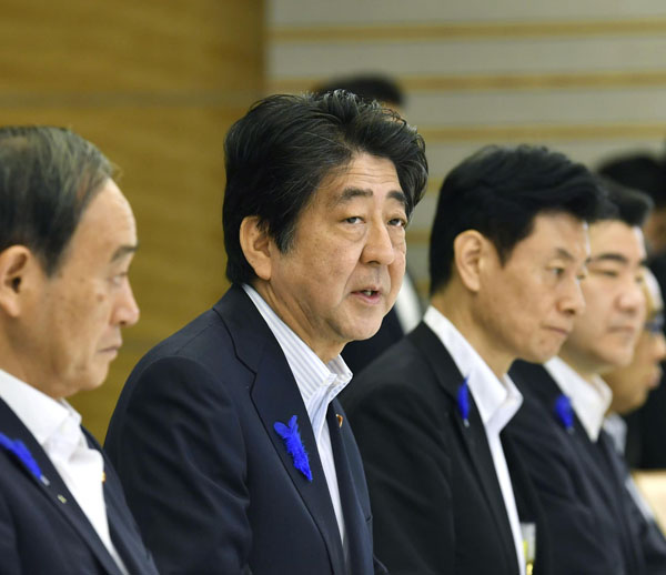顔がむくんでいる……(非常災害対策本部会議に出席)(C)共同通信社