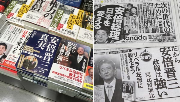 平積みされた礼賛本(左) 新聞広告も党員へのアピール(C)日刊ゲンダイ