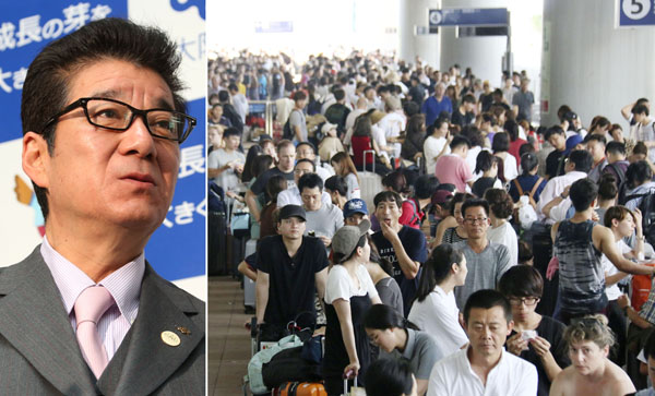 関空では疲れ切った旅客が長蛇の列(写真左は松井府知事)/(C)共同通信社