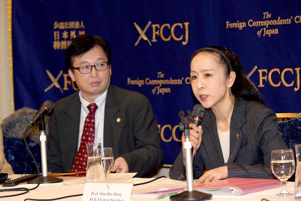 会見する申教授(右)と徳岡弁護士(C)日刊ゲンダイ