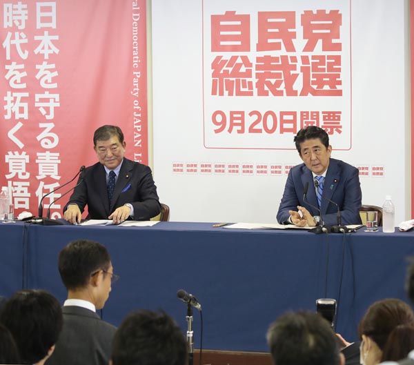 総裁選では「賃金上昇」を猛アピールした安倍首相(右)/(C)日刊ゲンダイ