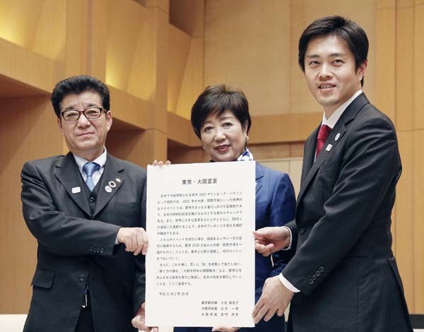議会空転のウラで松井大阪府知事(左)・吉村大阪市長(右)とシレッと会談(C)共同通信社