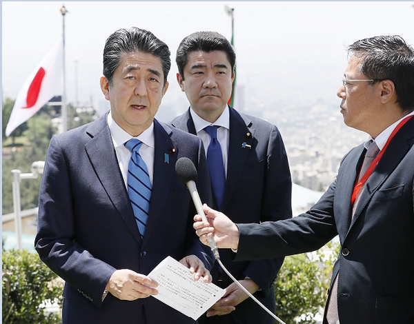 イランの最高指導者ハメネイ師との会談後、取材に応じる安倍首相(左)=13日、テヘラン(C)共同通信社