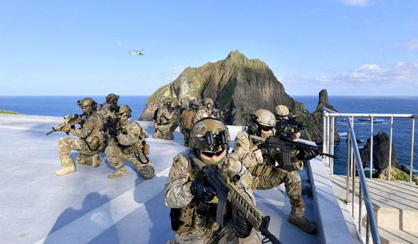 GSOMIAの破棄とほぼ同時に「竹島」で防衛訓練を始めた韓国海軍の特殊部隊/(韓国海軍提供・共同)