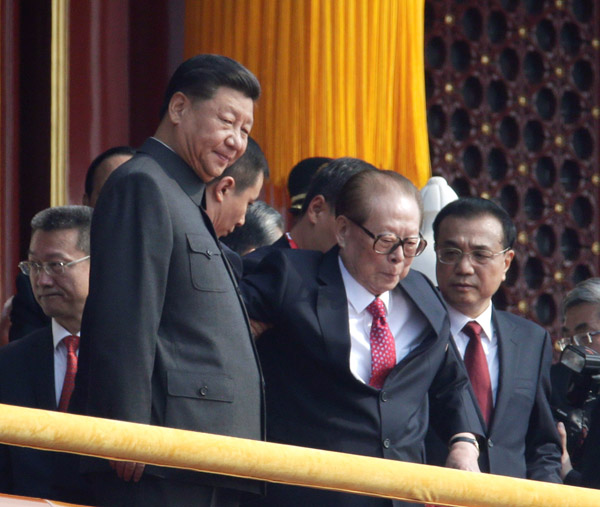 中国建国70年の記念式典での習近平国家主席(左)と江沢民元国家主席(C)ロイター