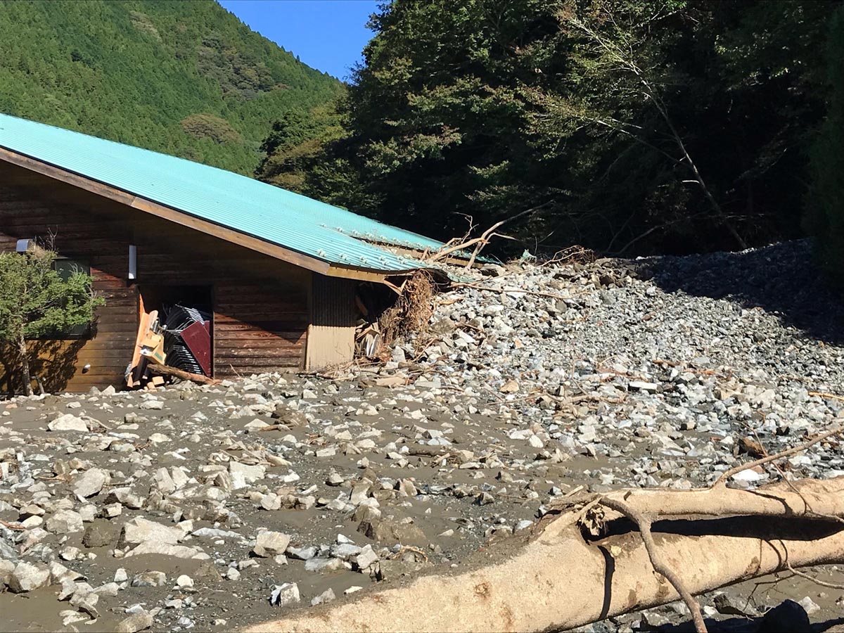 神奈川県山北町は前夜から断水、町の交流施設も屋根まで土砂が(同町提供)