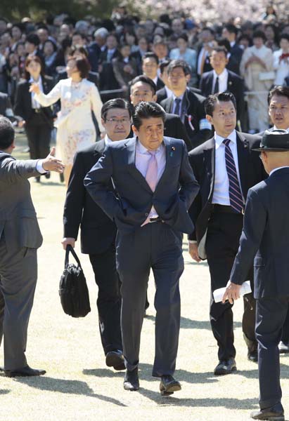 走り回って招待客に挨拶する安倍首相(2019年「桜を見る会」)/(C)日刊ゲンダイ