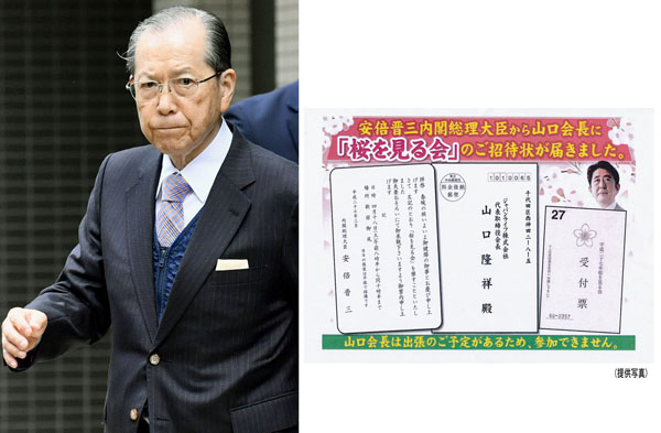 ジャパンライフの山口隆祥元会長と安倍首相主催の「桜を見る会」の招待状(C)共同通信社