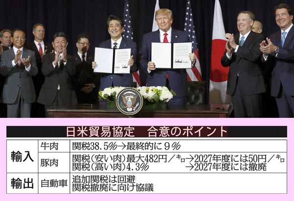 米農産物7・8千億円開放、日米貿易協定締結で共同声明に署名した安倍首相(中央左)とトランプ米大統領(C)共同通信社