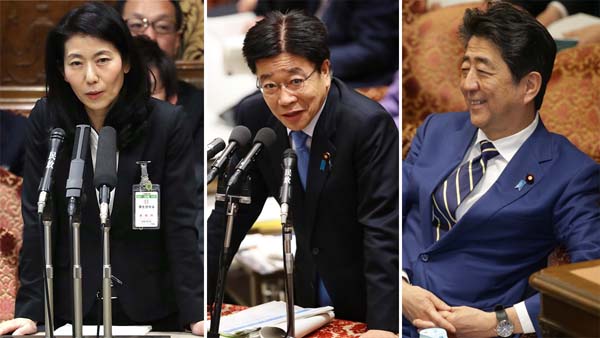 笑ってる場合か!(右から予算委での安倍首相、加藤厚労相、大坪大臣官房審議官)/(C)日刊ゲンダイ