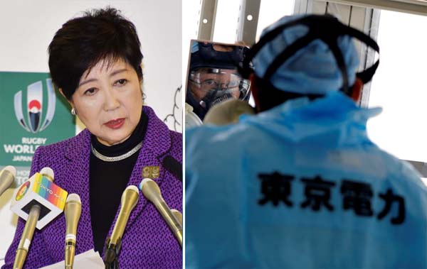 福島第1原発で働く作業員の「防護服」がない(左は小池百合子都知事)/(C)ロイター=共同