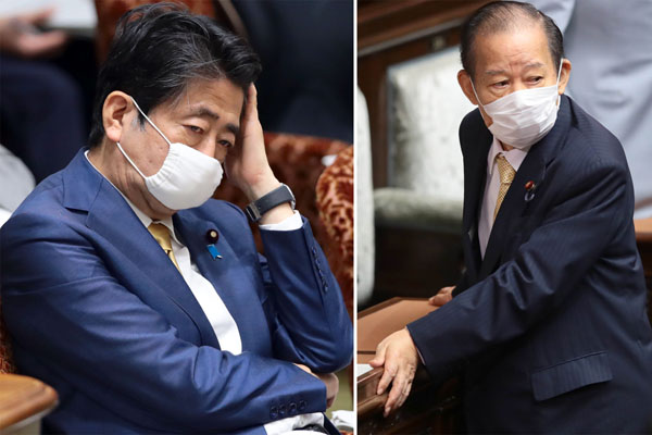 買収原資について、総裁である安倍首相の「説明は十分でない」が80%(右は、否定する二階自民党幹事長)/(C)日刊ゲンダイ