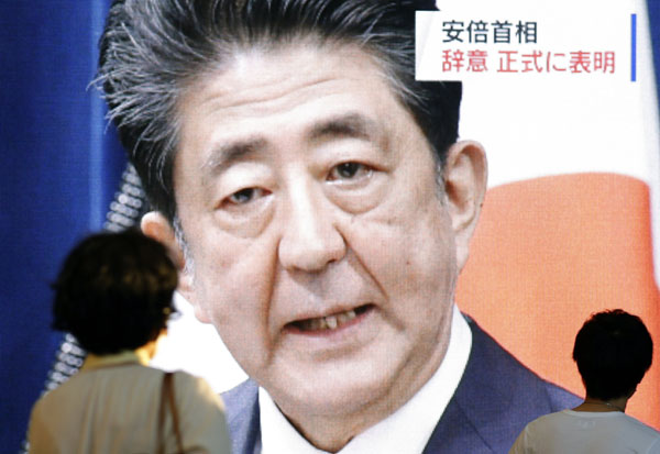安倍首相の辞意を伝える大阪・梅田のモニター(C)共同通信社