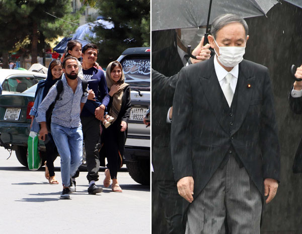 なす術なしの菅政権、逃げるに逃げれぬ国民の嘆き(左はタリバン進攻を受け、家路に急ぐカブールの人々/UPI=共同)