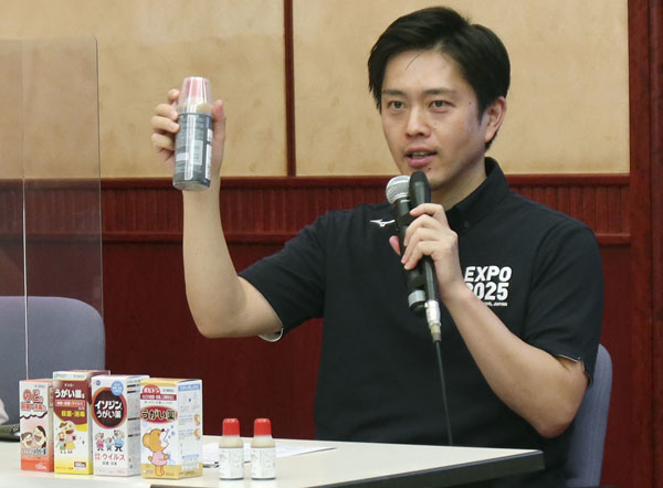 2020年8月、うがいを呼び掛ける大阪の吉村洋文府知事(C)共同通信社