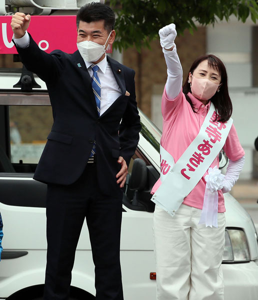 同じく立憲民主の泉健太代表(左)も第一声は福島の無所属・小野寺彰子候補のもとで(C)日刊ゲンダイ