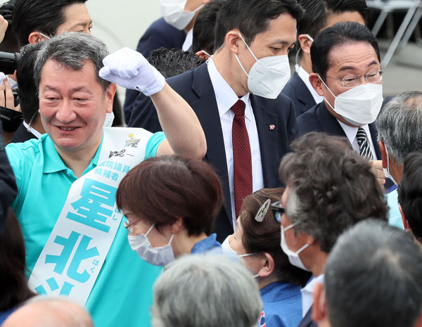 選挙初日は岸田首相(右)が駆け付けた自民・星北斗候補(C)日刊ゲンダイ