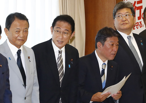 「新・男たちの悪巧み」の様相に…(自民党新執行部と岸田首相=左から2人め)/(C)日刊ゲンダイ