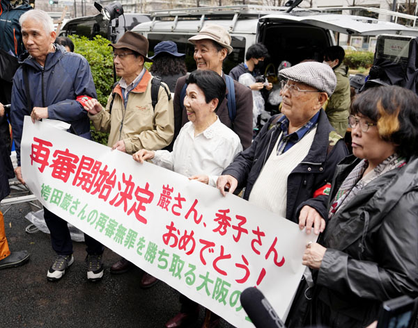 袴田巌さんの第2次再審請求の差し戻し審で再審開始が認められ、東京高裁前で支援者と写真に納まる姉ひで子さん(中央)/(C)共同通信社