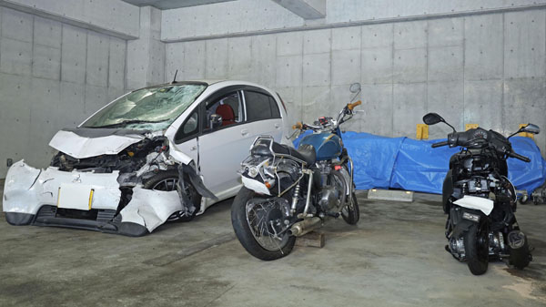 八田容疑者が現場に乗り捨てた車と、男子大学生2人が乗っていたバイク(C)共同通信社