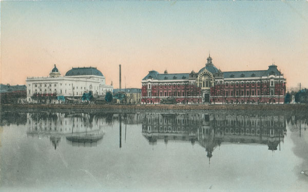 警視庁(日比谷赤煉瓦庁舎=右)と初代帝国劇場=明治後期(C)イマジンネット画廊所蔵/共同通信イメージズ