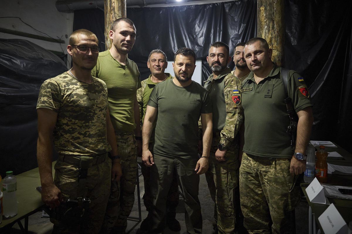ウクライナ東部ドネツク州の軍旅団司令部を激励に訪れ、兵士と記念撮影するゼレンスキー大統領(中央、=ウクライナ大統領府提供、AP=共同)
