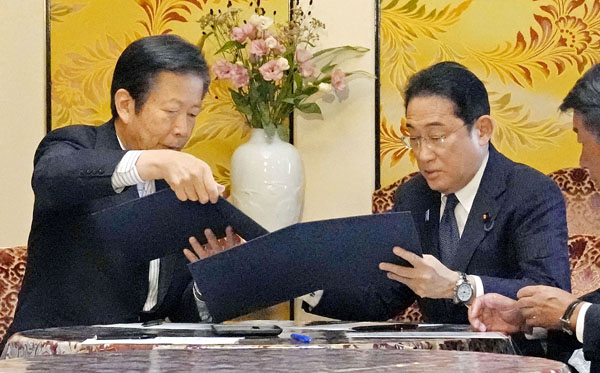 東京の選挙協力で自公が復活(党首会談での岸田首相と公明党の山口代表=左、4日)/(C)共同通信社