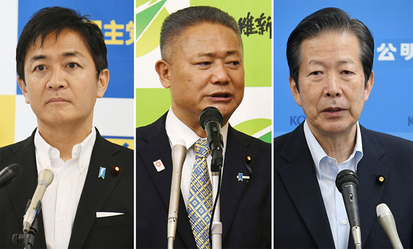 かたっぱしから?(左から国民民主の玉木代表、日本維新の会の馬場代表、公明党の山口代表)/(C)日刊ゲンダイ