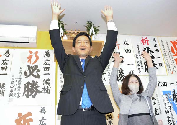 参院徳島・高知選挙区の補欠選挙で当選を決め万歳をする、野党支援の広田一氏(C)共同通信社