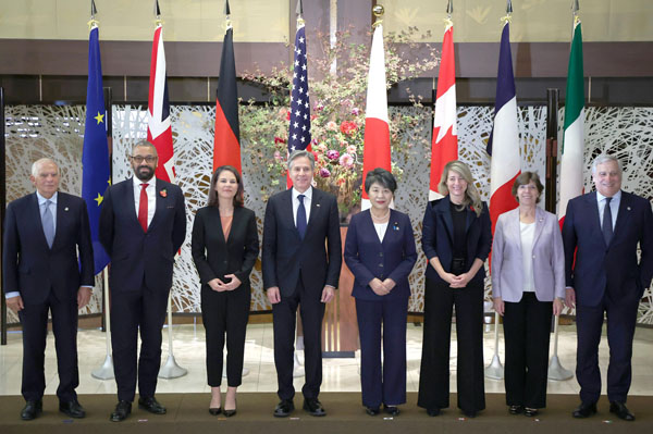 人道的休止しか踏み込めず、具体策実効性なしのG7外相会合(中央がブリンケン米国務長官と上川陽子外相、=代表撮影)