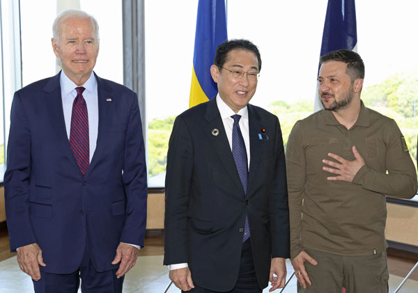 G7サミットでのスリーショット(代表撮影)