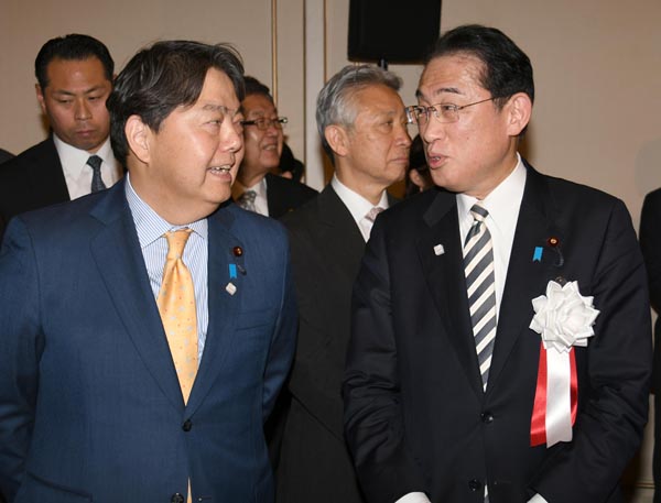 保身のためにナンバー2を取り込んだ?(2023年岸田派宏池会のパーティーで、林前外相と歓談する岸田首相=右)/(C)日刊ゲンダイ