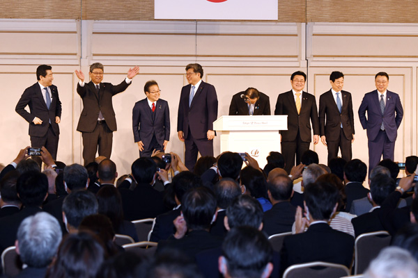安倍派「清和政策研究会」のパーティーで、ステージに並ぶ同派の幹部たち(C)日刊ゲンダイ
