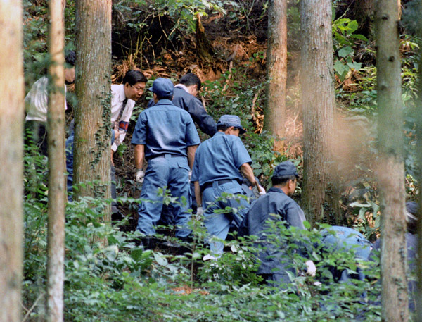 事件現場を捜索する捜査員(89年8月=奥多摩)/(C)共同通信社