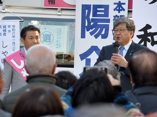 東京・八王子市長選挙、初宿和夫氏(左)の出陣式でサラッとおわび一言のみの萩生田光一前政調会長(右)/(C)日刊ゲンダイ