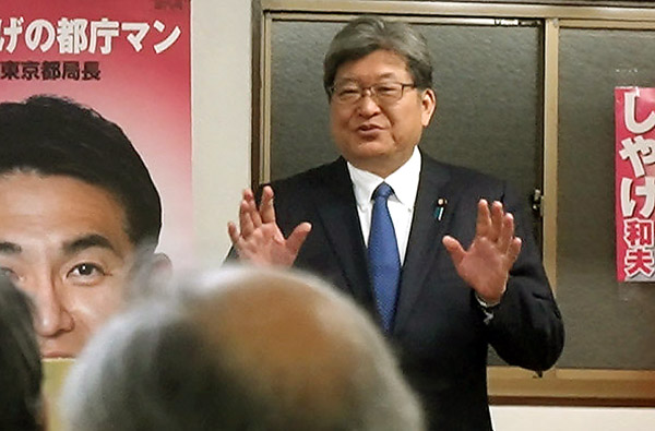 悪びれもせず言ってのけ、笑いを誘ってニンマリ(地元・八王子市長選の応援に駆け付けた萩生田光一前政調会長)/(写真)横田一氏