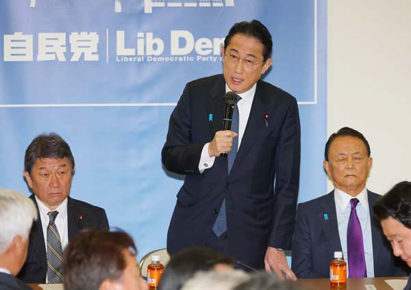麻生副総裁(右)と茂木敏充幹事長(左)を悪役に(自民「政治刷新本部」の会合であいさつする岸田首相)/(C)日刊ゲンダイ