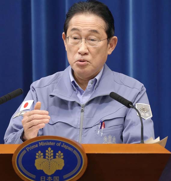 記者クラブ加盟社のみの限定会見に変更。官邸の岸田首相はお色直しで登場(C)共同通信社