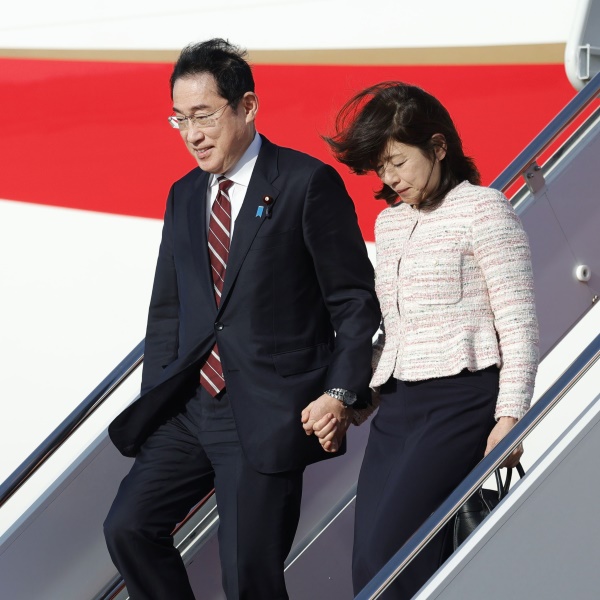 米ワシントン郊外のアンドルーズ空軍基地に到着した岸田首相(左)と妻の裕子さん=8日(C)共同通信社
