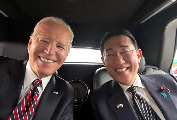 裏で進む大軍拡(「ビースト」に乗り、バイデン米大統領と笑顔満面の岸田首相)/(C)ロイター/EYEPRESS Images