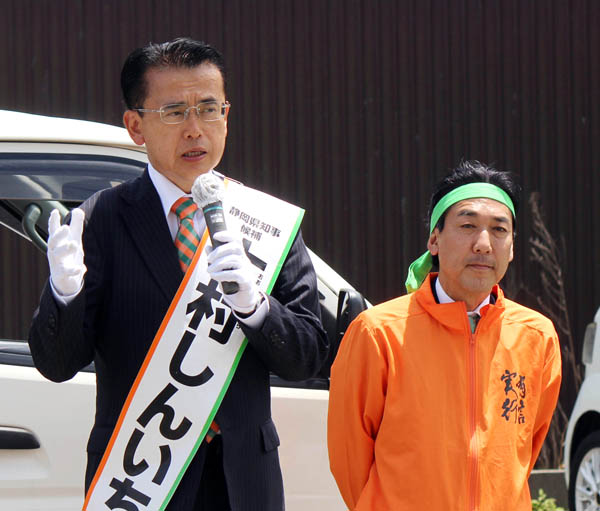 23日、劣勢の浜松市で演説する大村慎一候補と自民党の城内稔衆院議員(C)日刊ゲンダイ