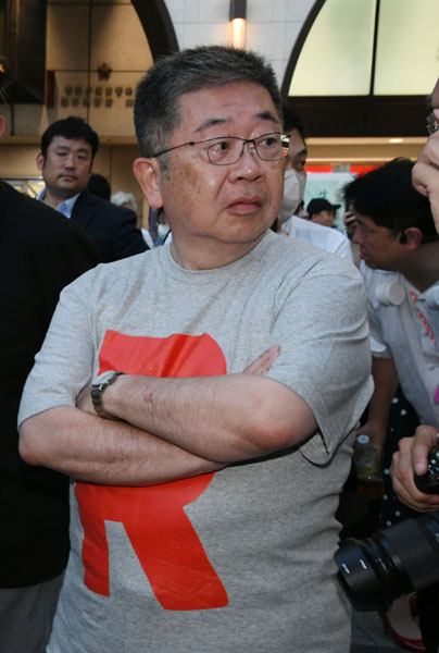 「R」Tシャツを着て応援に入った小池晃(C)日刊ゲンダイ