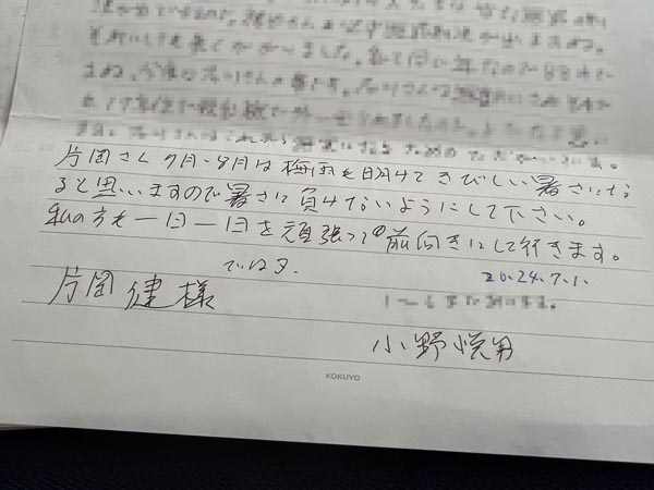 小野受刑者からの手紙(提供写真)