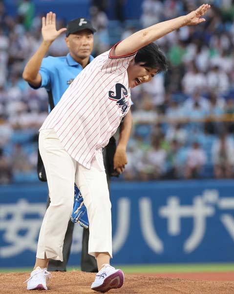 始球式でハッスル(小池百合子都知事)(C)日刊ゲンダイ