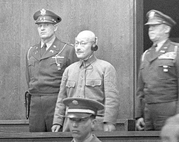 東京裁判で絞首刑の判決を聞く東條英機元首相(1948=昭和23=年11月12日、東京・市谷)/(C)共同通信社