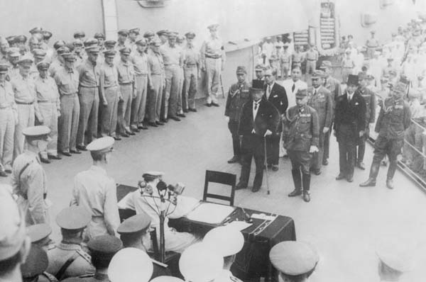 日本全権団の前で降伏文書に署名するマッカーサー元帥(1945=昭和20=年9月2日、東京湾の米軍艦ミズーリ号上で)/(C)共同通信社