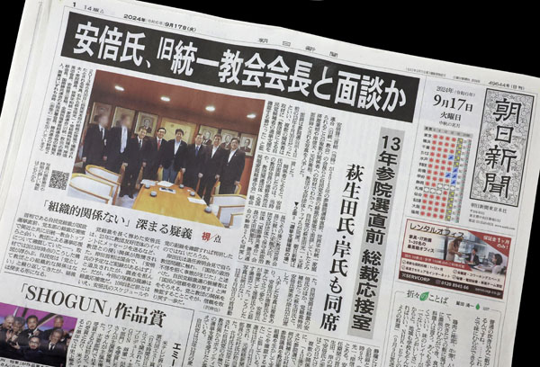 安倍の脇には教団トップの幹部たちが…(C)日刊ゲンダイ