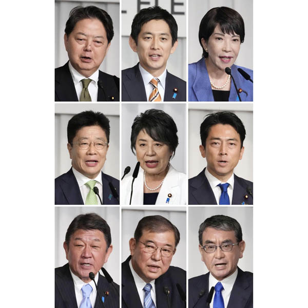 9人揃い踏み(右から左へ、上段から下段へ)高市早苗氏、小林鷹之氏、林芳正氏、小泉進次郎氏、上川陽子氏、加藤勝信氏、河野太郎氏、石破茂氏、茂木敏充氏(C)共同通信社